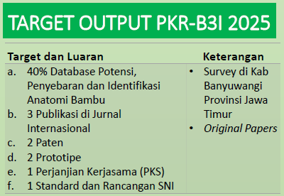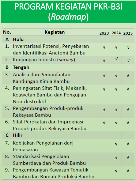 Pusat Kolaborasi Riset Biomassa dan Bioproduk Bambu Indonesia (PKR-B3I) ini dibentuk sebagai media bagi periset dan berbagai pihak dalam mengembangkan Science, Technology and Innovation (STI), sehingga dapat menjadi pusat rujukan (center of excellence) penyediaan database terpadu untuk mendukung penelitian dan pengembangan bambu di Indonesia.